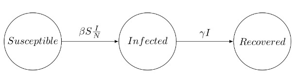 The Susceptible-Infected-Recovered (SIR) model is standard for disease transmission. It splits the population into three categories: the susceptible, the infected and the recovered. When a susceptible individual comes into contact with an infectious individual, the former can become infected for some time, and then recover and become immune. The dynamics can be summarized graphically: