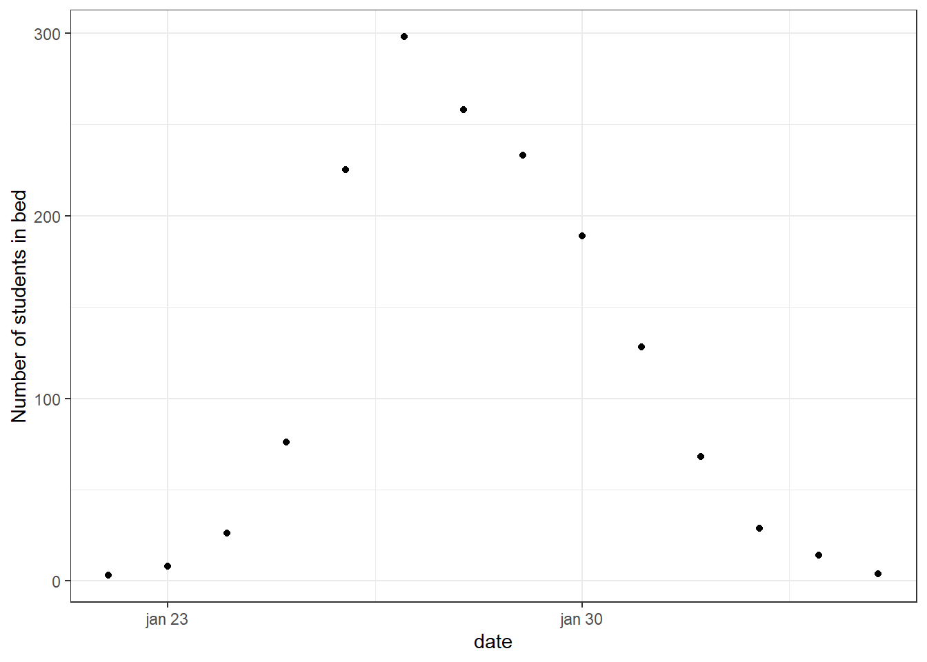 The data consists of the daily number of students in bed, spanning over a time interval of 14 days. There were 763 male students who were mostly full boarders and 512 of them became ill. The outbreak lasted from the 22nd of January to the 4th of February. It is reported that one infected boy started the epidemic, which spread rapidly in the relatively closed community of the boarding school.